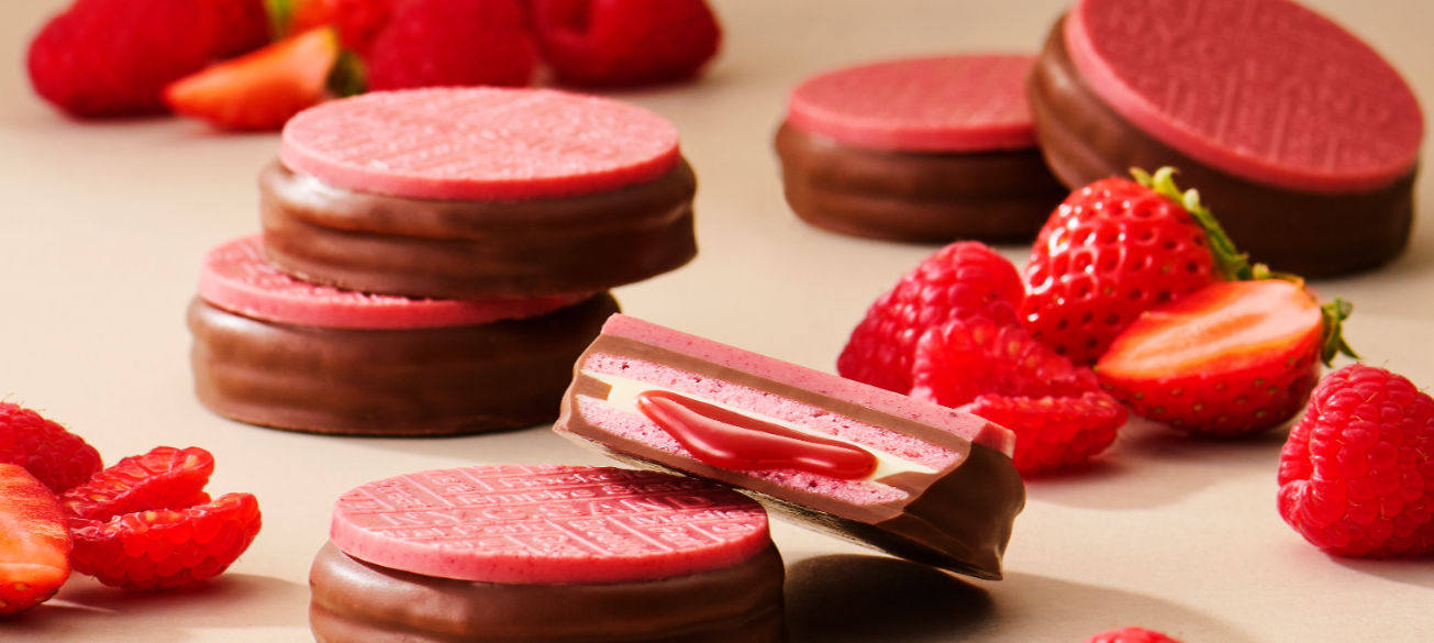 艶やかにとろけるラズベリーキャラメルとホワイトチョコレートをストロベリークッキーでサンドし、ミルクチョコレートで包み込みました。
