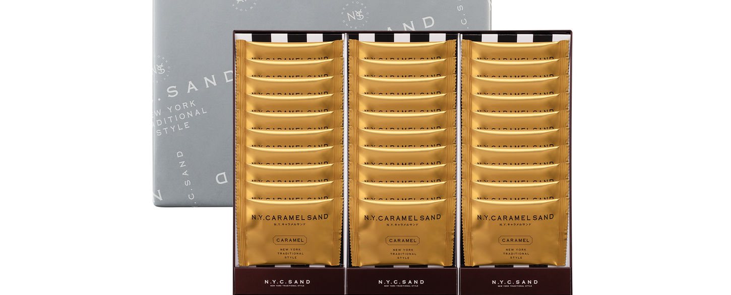 定番商品の「N.Y.キャラメルサンド」「N.Y.スカッチサンド」に期間限定の味「N.Y.ヘーゼルナッツカカオキャラメルサンド」を入れた詰合せギフトボックスです。