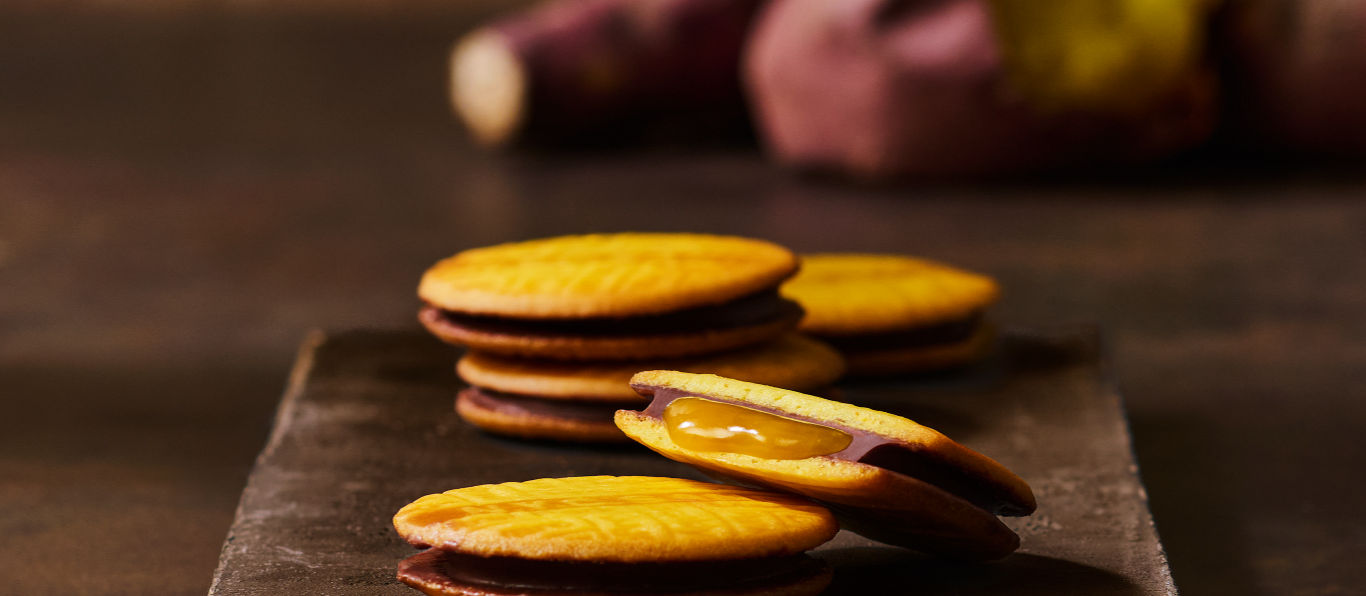 さつま芋のパウダーとペーストを混ぜ合わせて、バターと生クリームで香り高く炊き上げたとろけるキャラメルをミルクチョコレートで包み込み、さつま芋の香り豊かなバタークッキーでサンドしました。